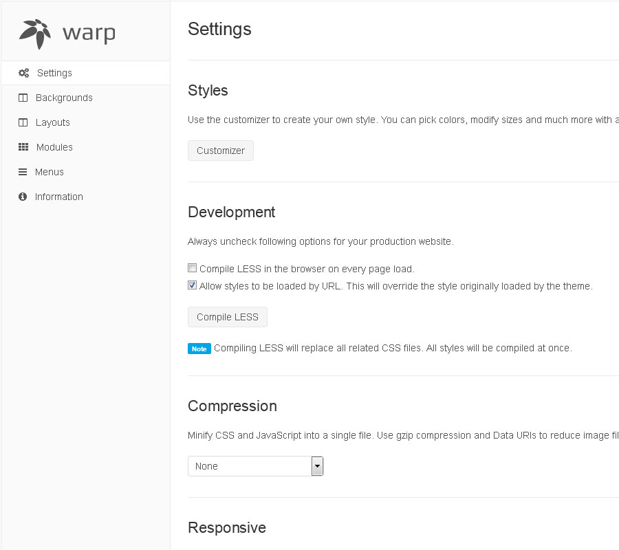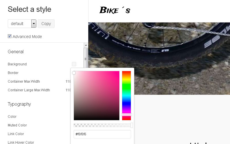 The style section contains the customizer. Hit the Customizer button to add your own style or to modify an existing style. After the customizer is loaded, you can easily customize colors, fonts, margins and even more settings of the theme. The customizer saves only the modified variables and automatically compiles them into CSS.